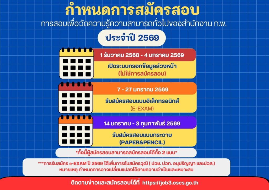 สำนักงาน ก.พ. ประกาศกำหนดการสอบวัดความรู้ความสามารถทั่วไป สอบ ก.พ. ประจำปี 2569 รายละเอียดด้านล่าง